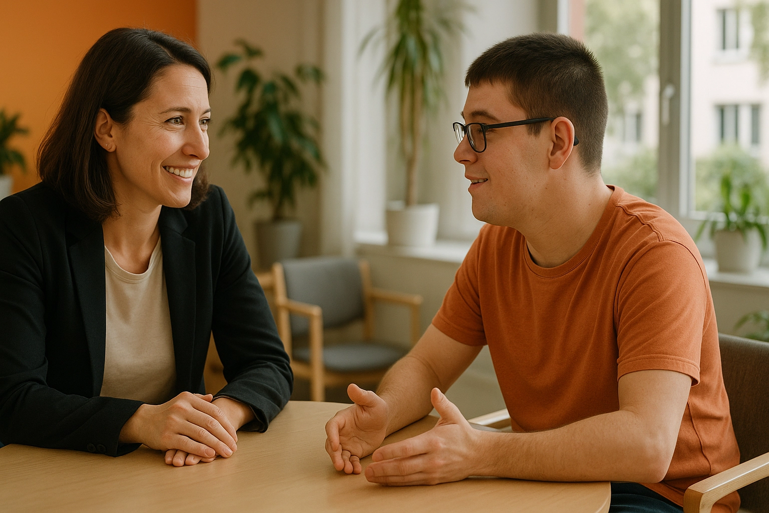 Un professionnel de l’Adages et une personne accompagnée échangent autour de la Charte de l’autodétermination, dans une atmosphère lumineuse et bienveillante à Montpellier.