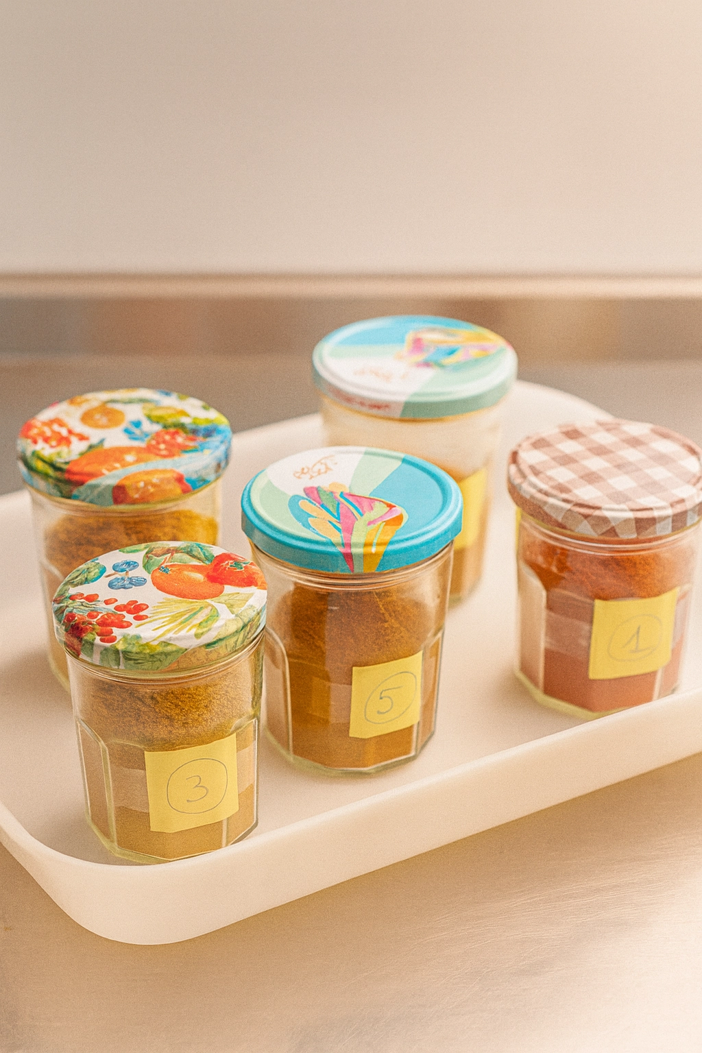 Atelier sensoriel de la Semaine du Goût au DITEP Bourneville avec des bocaux d’épices numérotés, sur un plateau blanc en cuisine pédagogique.