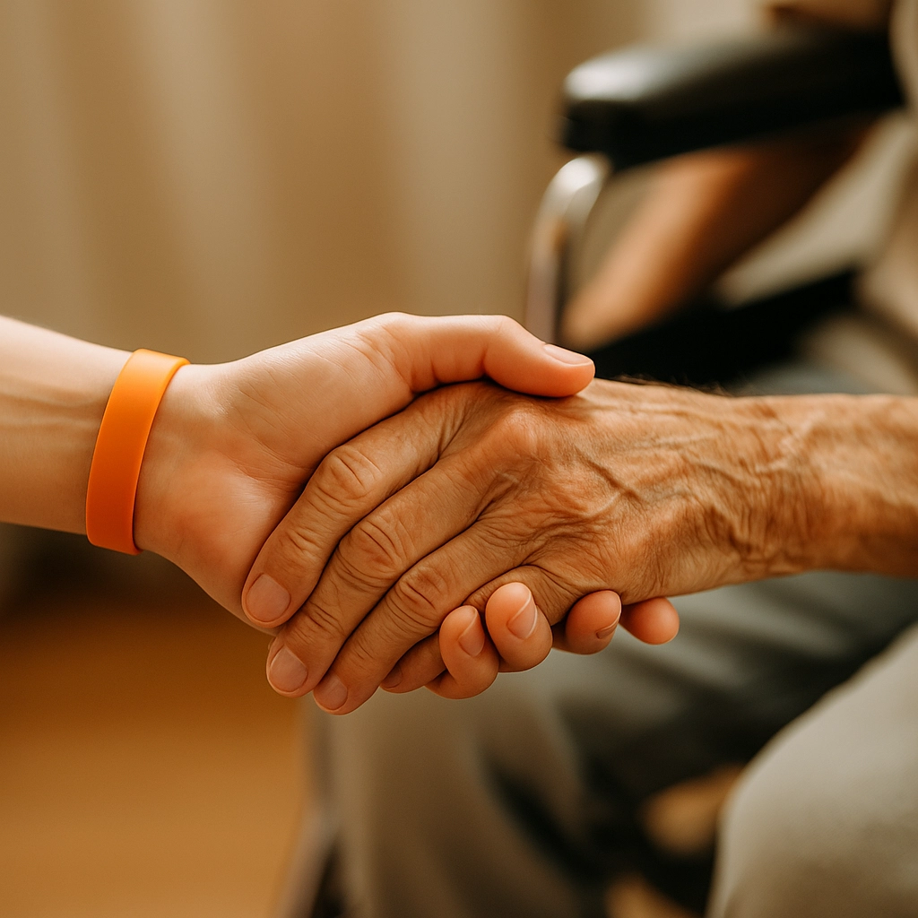 Geste de solidarité entre une main portant un bracelet orange et celle d’une personne âgée en fauteuil, illustrant le lien humain et l’inclusion dans l’Hérault.