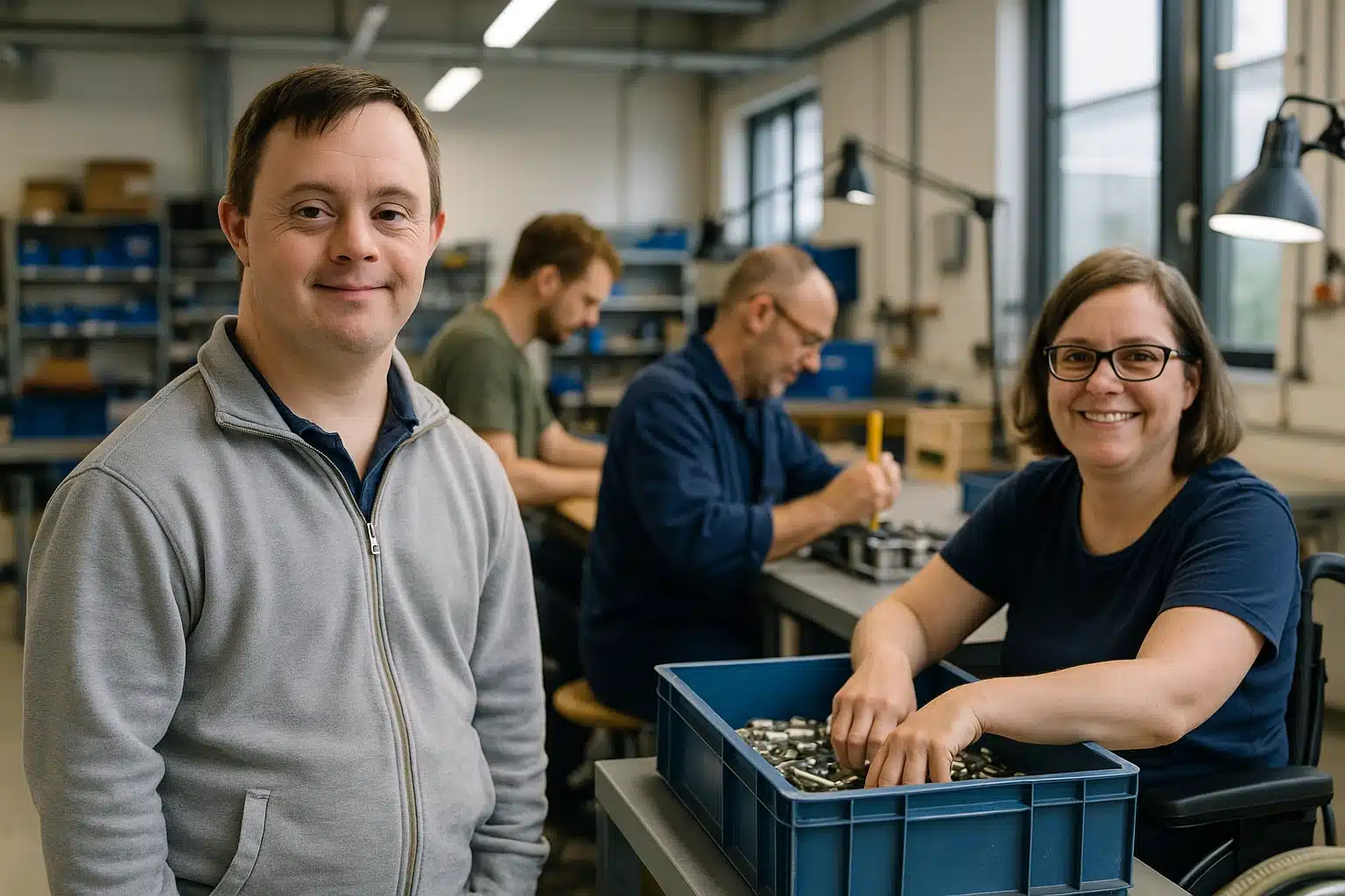 Professionnels avec et sans handicap travaillant ensemble dans un atelier inclusif moderne, illustrant l’autodétermination et la dignité professionnelle au sein des ESAT de l’Adages